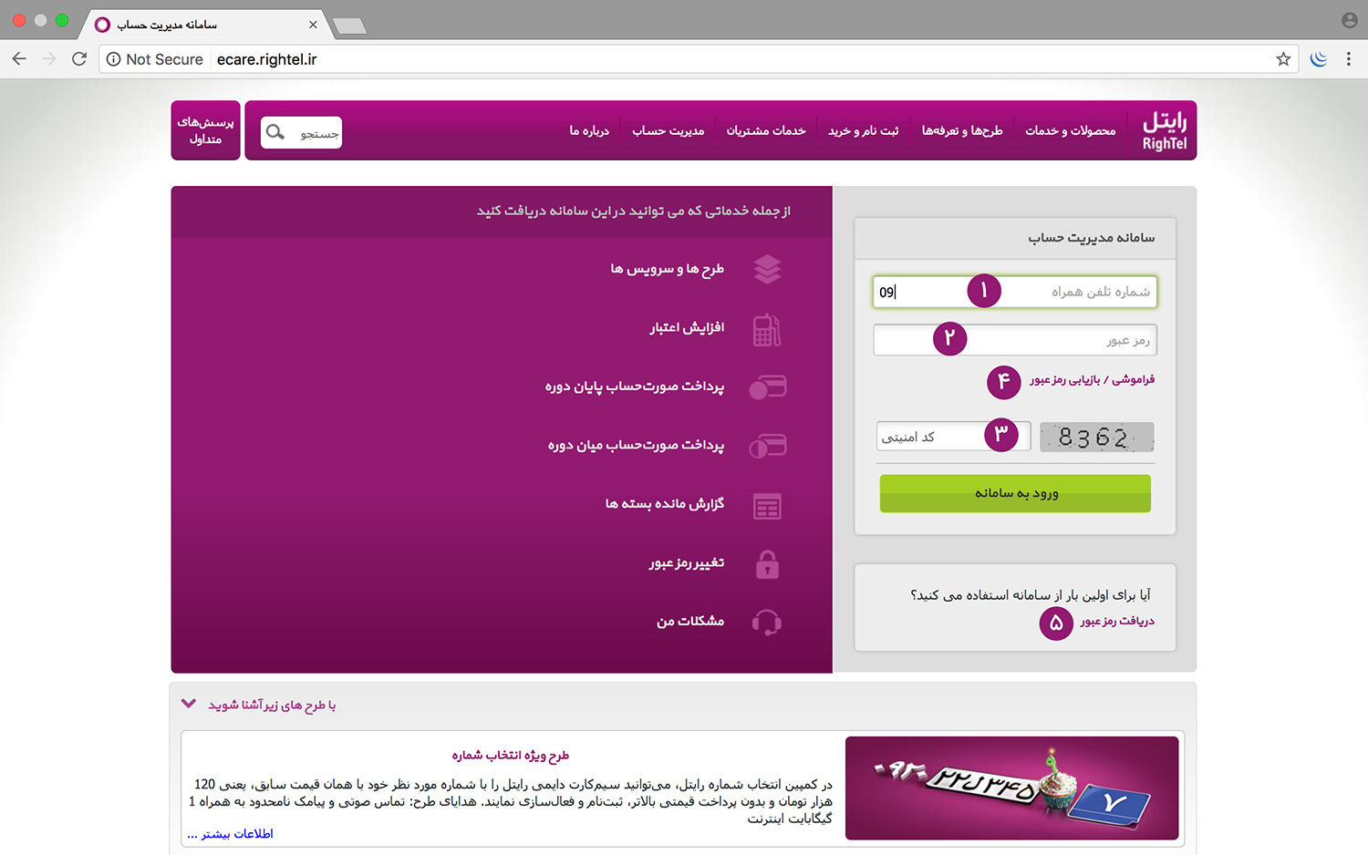 برای مشاهده میزان شارژ سیم کارت و یا افزایش اعتبار سیم کارت های اعتباری رایتل ابتدا وارد سایت بالا شوید.