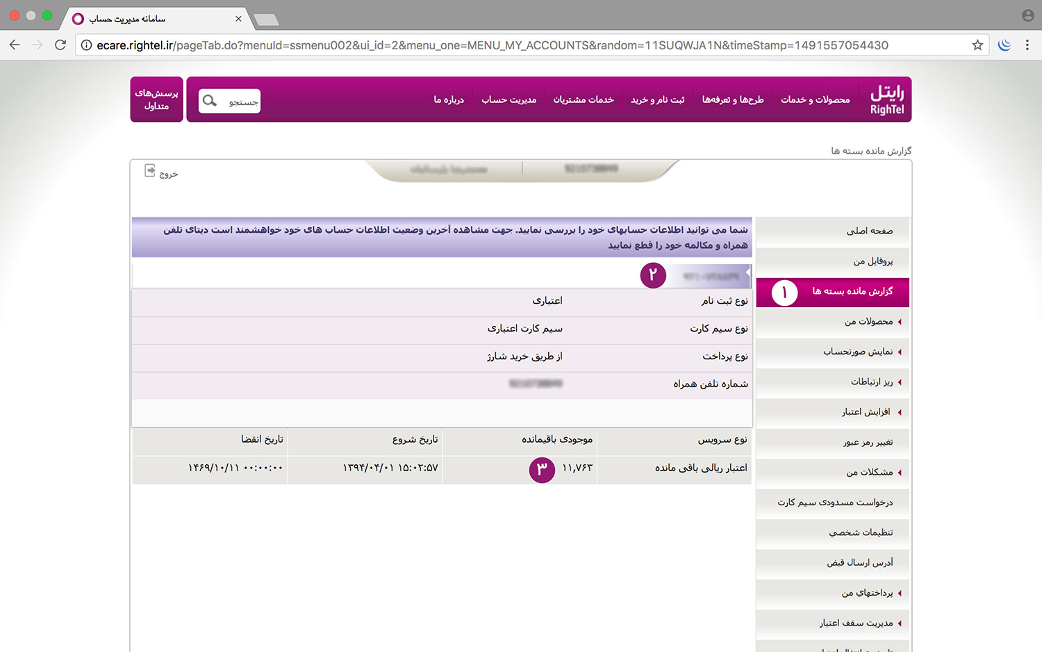 در صفحه مدیریت حساب کاربری٬‌ با انتخاب گزینه گزارش مانده بسته ها و انتخاب شماره تلفن مورد نظر خود می توانید میزان اعتبار فعلی سیم کارت خود را مشاهده نمایید.