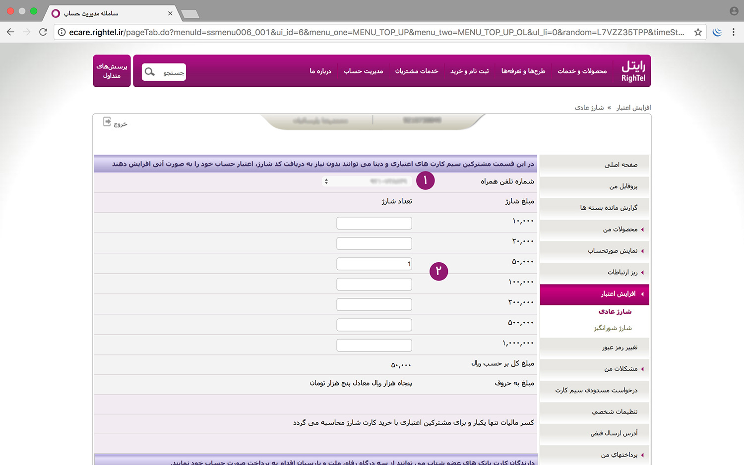 برای افزایش اعتبار می توانید از منوی سمت راست گزینه افزایش اعتبار را انتخاب کنید و بعد از انتخاب نوع شارژ(شارژ عادی و شارژ شورانگیز)٬ اقدام به افزایش اعتبار سیم کارت خود کنید.