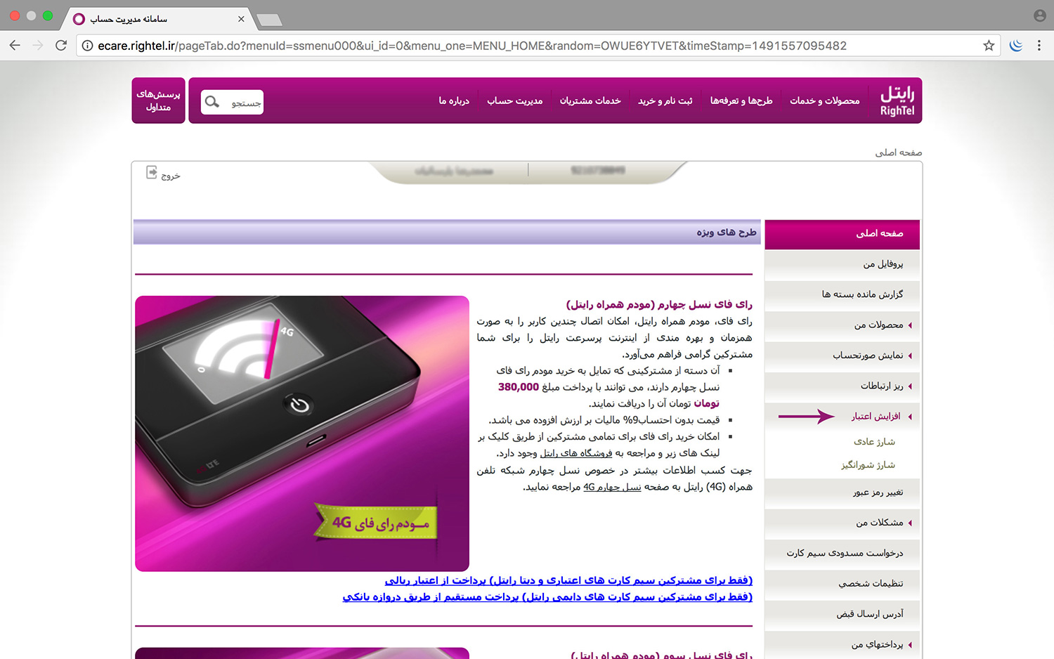 برای مشاهده میزان شارژ سیم کارت و یا افزایش اعتبار سیم کارت های اعتباری رایتل ابتدا وارد سایت بالا شوید.